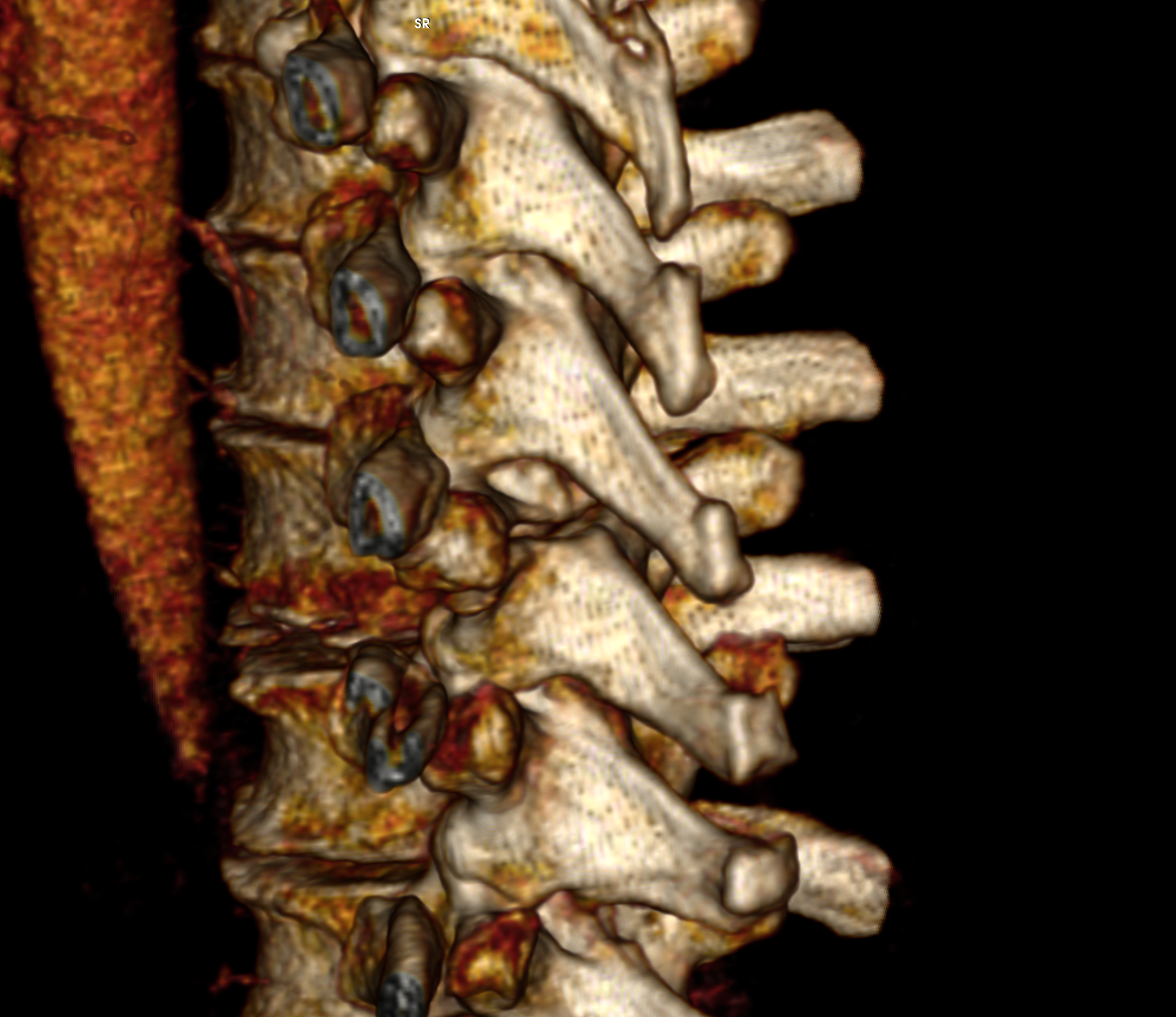 The vertebrae illustrations were done in Photoshop and the rods and screws were modeled in Maya and then integrated into the piece using Photoshop.